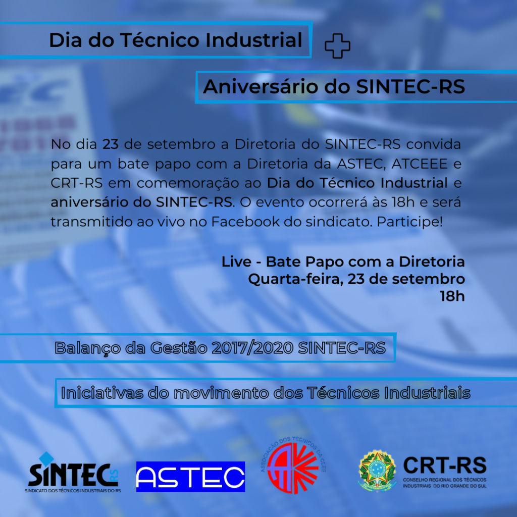 No dia 23 de setembro a Diretoria do SINTEC-RS convida para um bate papo com a Diretoria da ASTEC, ATCEEE e CRT-RS em comemoração ao Dia do Técnico Industrial e aniversário do SINTEC-RS.