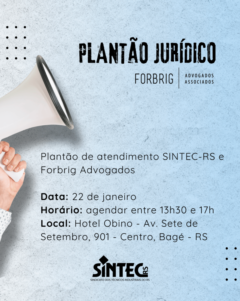 O SINTEC-RS, em parceria com o escritório Forbrig Advogados Associados, realizará um plantão jurídico em Bagé, no dia 22 de janeiro.