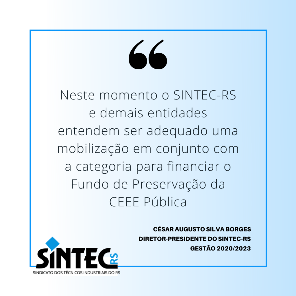 O Fundo de Preservação da CEEE Pública foi uma iniciativa dos três sindicatos, SINTEC-RS, Senge-RS e Senergisul, com apoio das demais entidades representativas dos trabalhadores da empresa. Na reunião de articulação da iniciativa ficou claro que o movimento sindical enfrenta dificuldades financeiras em toda a sua estrutura.