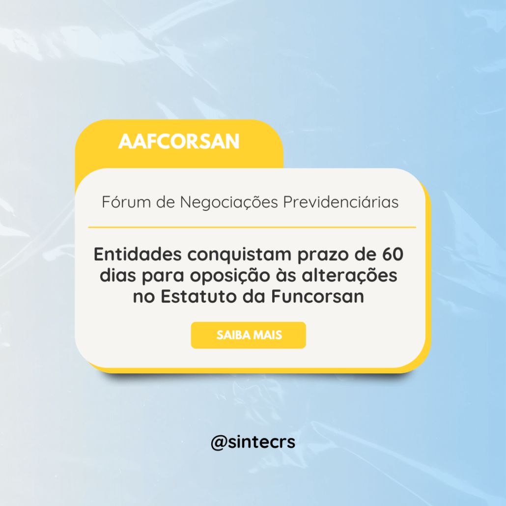 Após mobilização da AAFCorsan, em conjunto com o SINTEC-RS, Sindiágua/RS, SENGE/RS e SINDAERGS, a PREVIC comunicou a concessão do prazo de dois meses para debates em torno das alterações no Estatuto da Funcorsan.