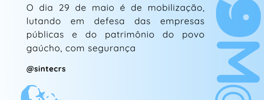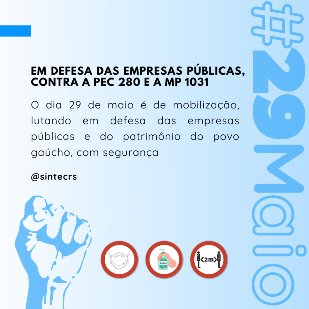 De acordo com o jornal Brasil de Fato, o local de concentração e trajeto ainda serão decididos, devido às necessidades de segurança sanitária. Vamos, juntos, defender as empresas públicas no dia 29 de maio! Lembre-se de usar máscara, álcool gel e manter 2 metros de distância dos demais participantes.