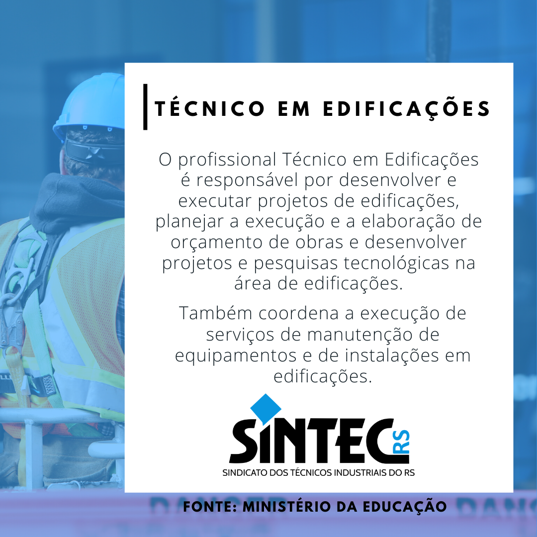 O profissional Técnico em Edificações é responsável por desenvolver e executar projetos de edificações, planejar a execução e a elaboração de orçamento de obras e desenvolver projetos e pesquisas tecnológicas na área de edificações. Também coordena a execução de serviços de manutenção de equipamentos e de instalações em edificações.