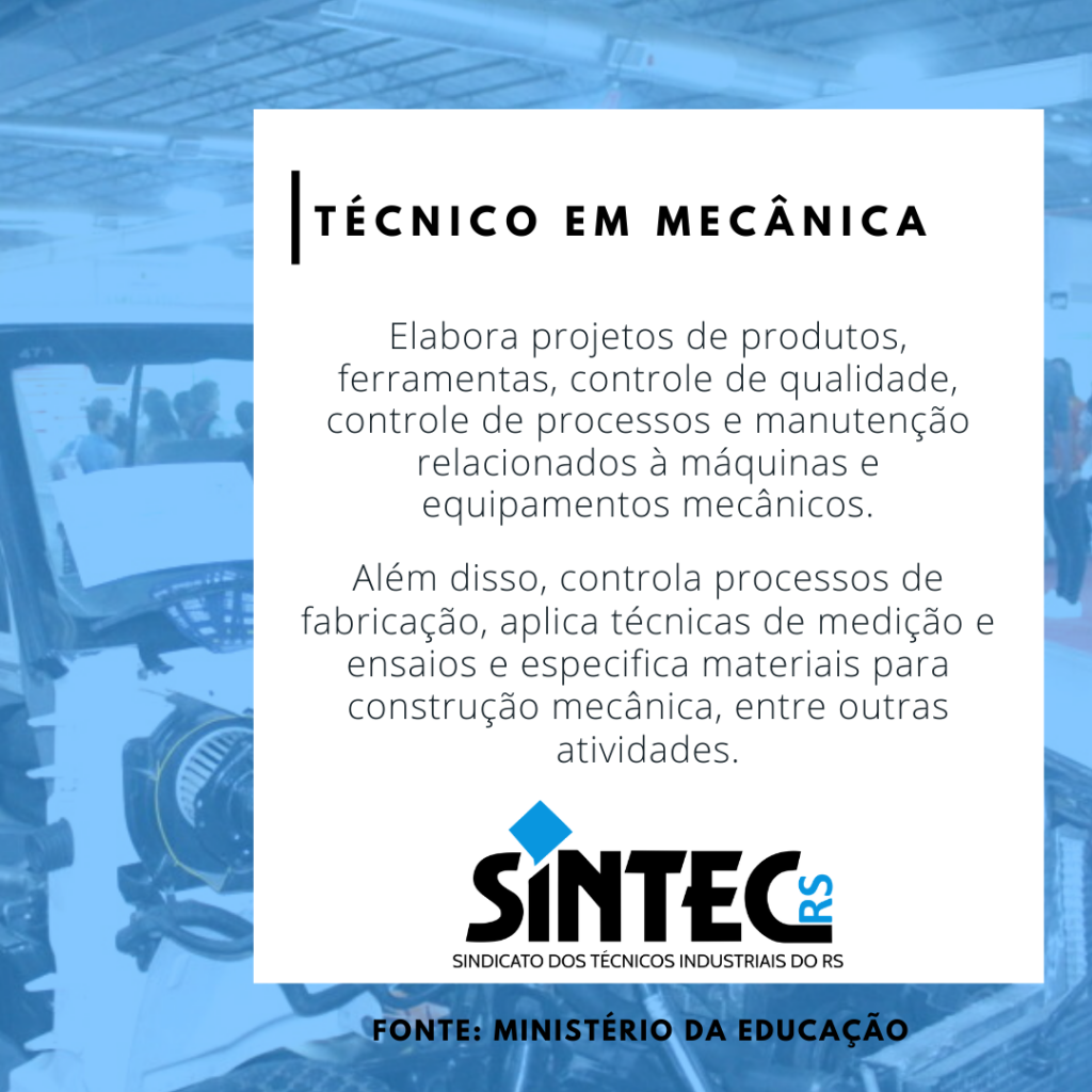 O profissional Técnico em Mecânica elabora projetos de produtos, ferramentas, controle de qualidade, controle de processos e manutenção relacionados à máquinas e equipamentos mecânicos. Também planeja, aplica e controla procedimentos de instalação, de manutenção e inspeção mecânica de máquinas e equipamentos, opera equipamentos de usinagem, aplica procedimentos de soldagem e realiza interpretação de desenho técnico. Além disso, controla processos de fabricação, aplica técnicas de medição e ensaios e especifica materiais para construção mecânica.