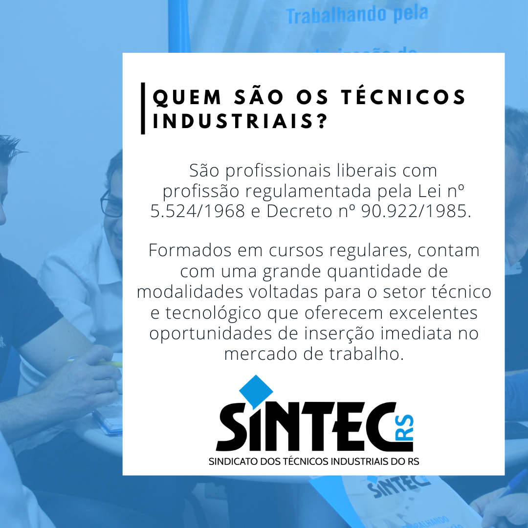 Os Técnicos Industriais são profissionais liberais com profissão regulamentada pela Lei nº 5.524/1968 e Decreto nº 90.922/1985, devidamente habilitados para o desempenho de suas atribuições.