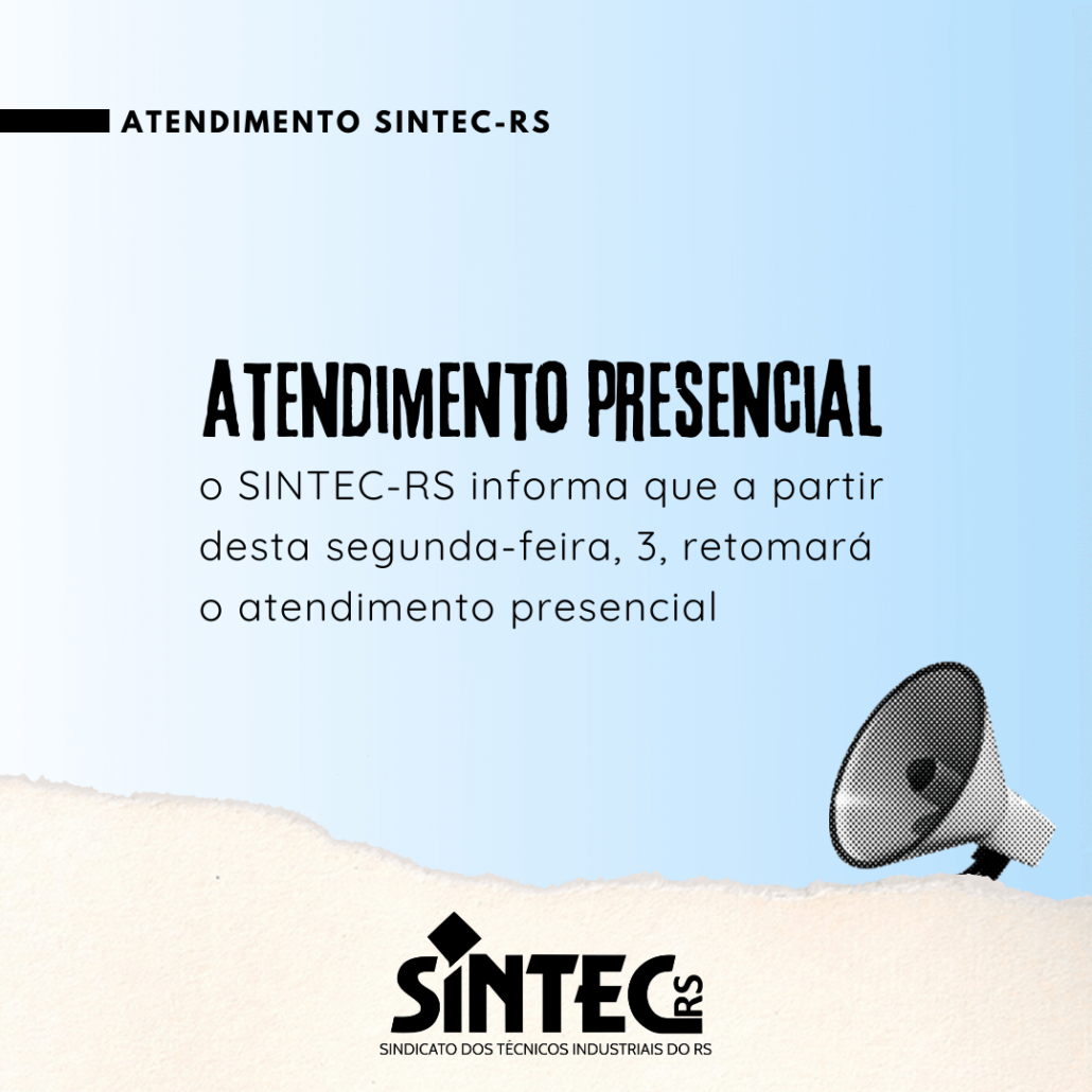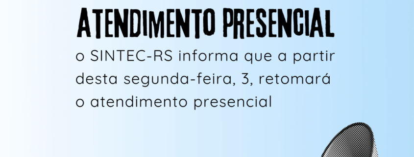 O SINTEC-RS informa que a partir desta segunda-feira, 3 de janeiro, retomará o atendimento presencial na sede do sindicato, das 9h às 16h, de segunda à sexta-feira. O atendimento via WhatsApp, e-mail e telefone segue normalmente.