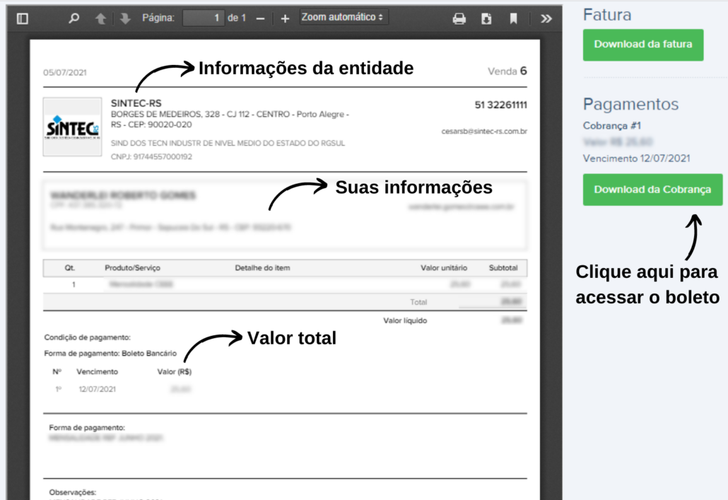 3. Clique em “Download da Cobrança” para ter acesso ao boleto de pagamento.