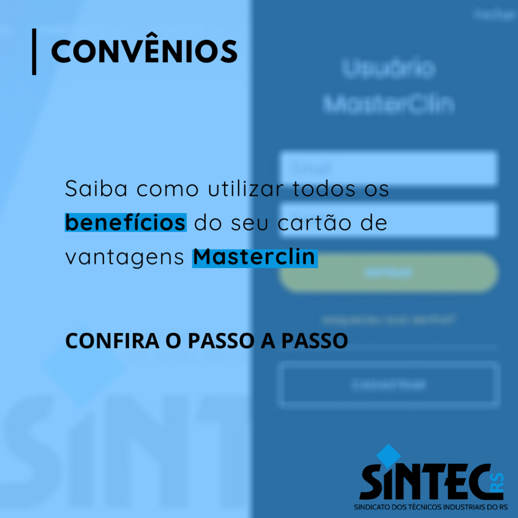 O SINTEC-RS em parceria com a Masterclin oferece aos seus associados todos os benefícios do cartão Masterclin. São mais de 9 mil estabelecimentos com descontos e vantagens fornecidos mediante a apresentação do cartão em lojas físicas, comércios online e serviços em geral.