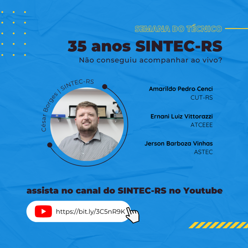 Na semana do dia 23 de setembro o SINTEC-RS promoveu a Semana do Técnico, com uma série de lives com temas voltados para a categoria dos Técnicos e Técnicas Industriais. Se você não conseguiu assistir ao vivo e quer saber mais sobre a história do movimento sindical e a importância das entidades representativas da classe trabalhadora, acesse o canal do sindicato no Youtube e assista a live 35 anos SINTEC-RS e história do movimento sindical, com a participação de representantes da CUT-RS, da ATCEEE e ASTEC.