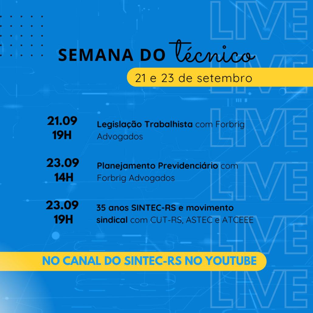 Nos dias 21 e 23 de setembro o SINTEC-RS realizará a Semana do Técnico, com programação online especial para o Dia do Técnico Industrial e para a comemoração de 35 anos do sindicato.