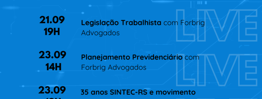 - 21/09 às 19h: Legislação Trabalhista com Dr. Alexandre Pastl, do escritório Forbrig Advogados