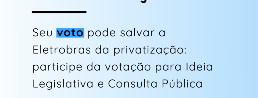 Além disso, a Ideia Legislativa que visa proibir a privatização da Eletrobras também está em votação no site do Senado. Ao receber 20.000 apoios, a ideia se tornará uma Sugestão Legislativa e será debatida pelos Senadores e, até o momento, a ideia já recebeu 15.825 apoios. Acesse o site do Senado e vote em apoiar! Clique aqui para votar.