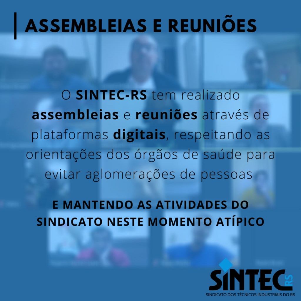 O SINTEC-RS está mantendo a rotina de assembleias e reuniões do sindicato através de plataformas digitais. Os encontros são realizados em ambiente virtual, respeitando as orientações dos órgãos de saúde e evitando a aglomeração de pessoas.