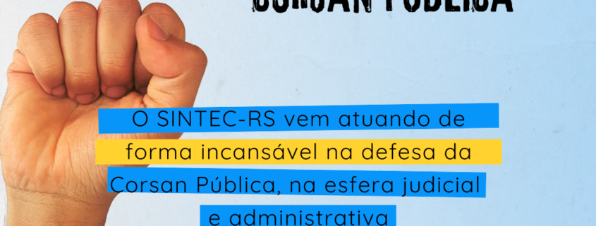 O SINTEC-RS vem atuando de forma incansável na defesa da Corsan Pública. Em que pese os desdobramentos da última semana, com a liberação por parte do Presidente do TCE para a assinatura do contrato de venda, as ações em defesa da empresa persistem. O SINTEC-RS vem atuando na forma judicial e administrativa, buscando a anulação da venda da empresa, diante das inúmeras irregularidades apresentadas.