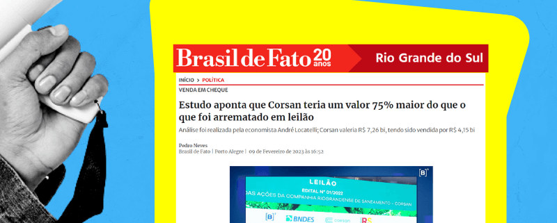 Um estudo solicitado pelo Sindicato dos Técnicos Industriais de Nível Médio do Estado do Rio Grande do Sul (SINTEC-RS) afirma que a Companhia Riograndense de Saneamento (Corsan) teria sido vendida por um valor muito abaixo do que a empresa realmente valeria. O estudo foi conduzido por André Locatelli, economista, professor e administrador de carteira de valores mobiliários.