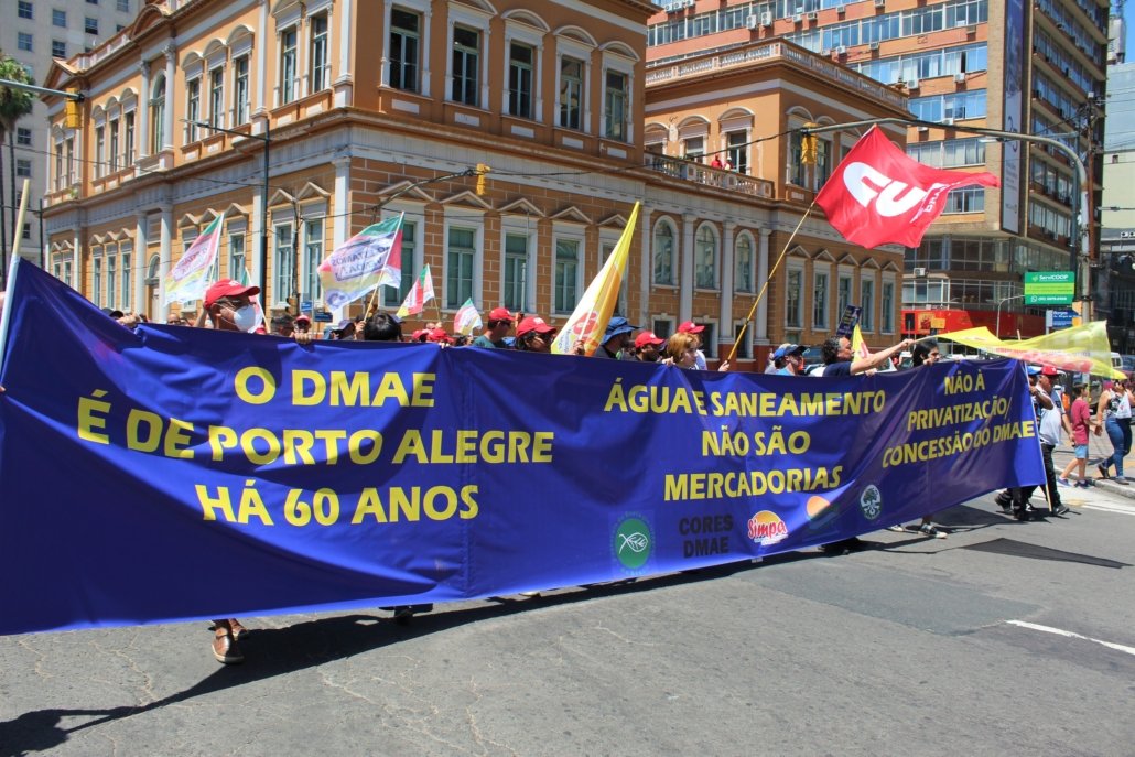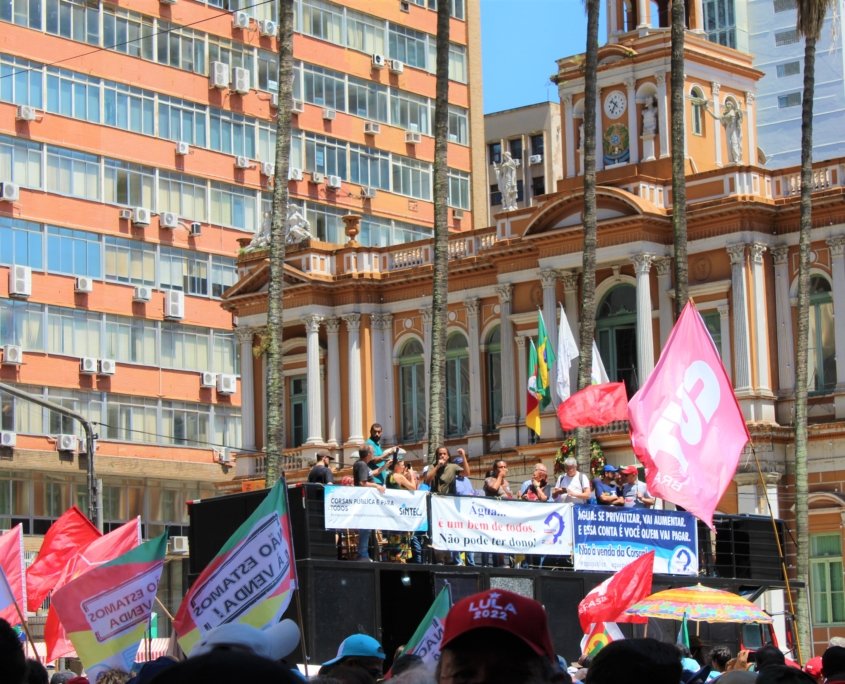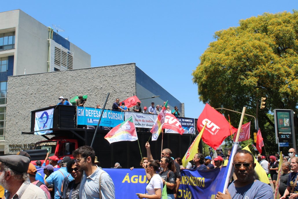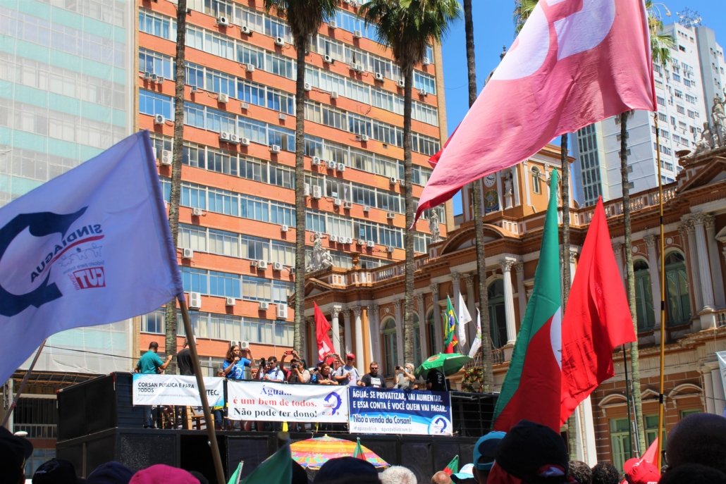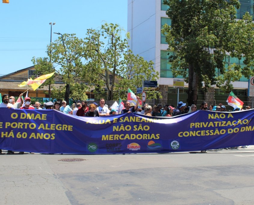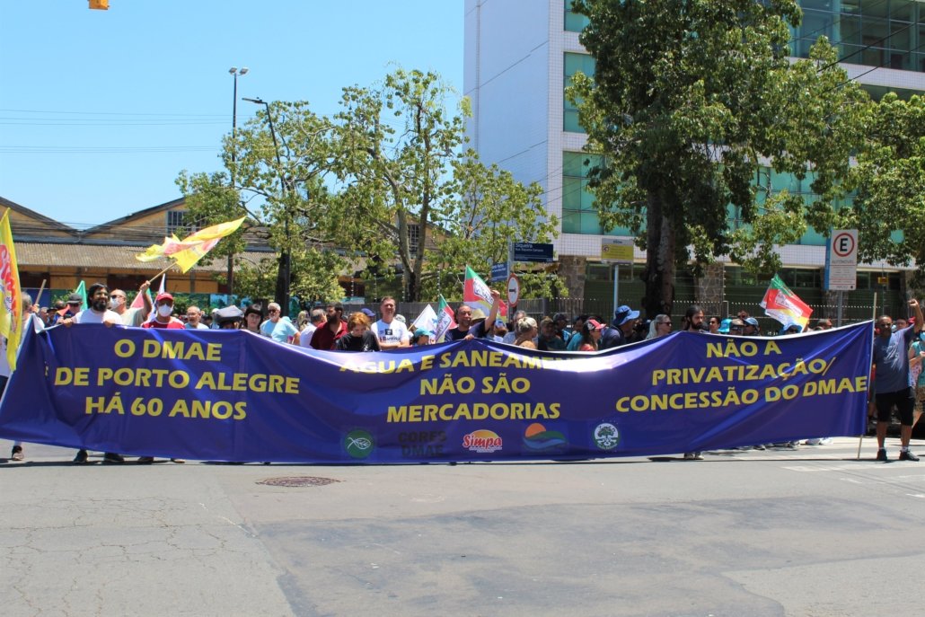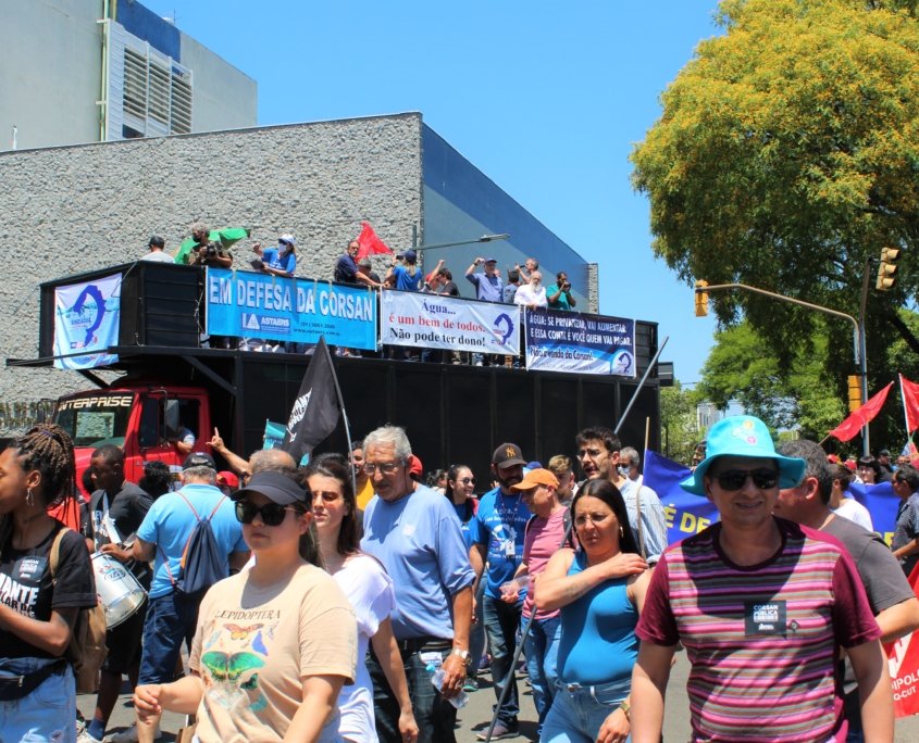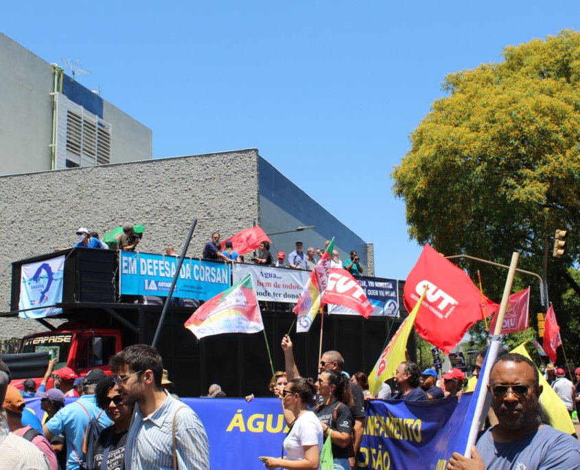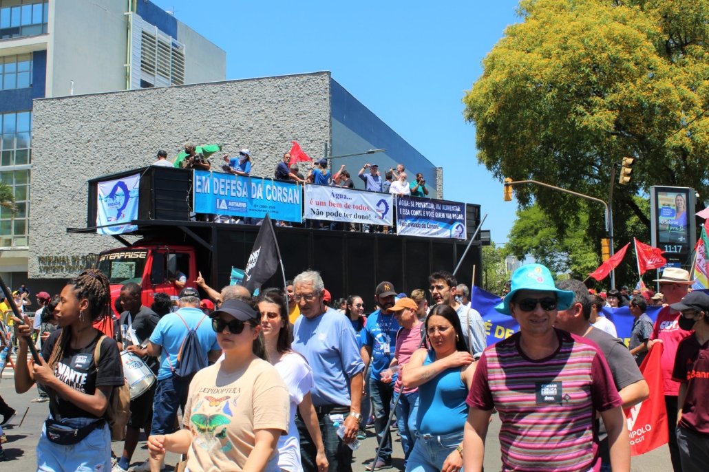 A manifestação, que defende a manutenção da Corsan e do DMAE públicos, reuniu sindicatos, trabalhadores e trabalhadoras das duas empresas, representantes da classe política e movimentos sociais na defesa da água pública.