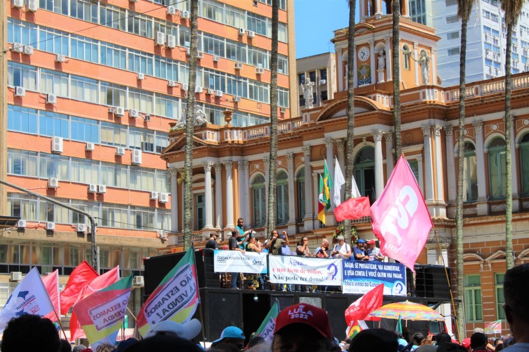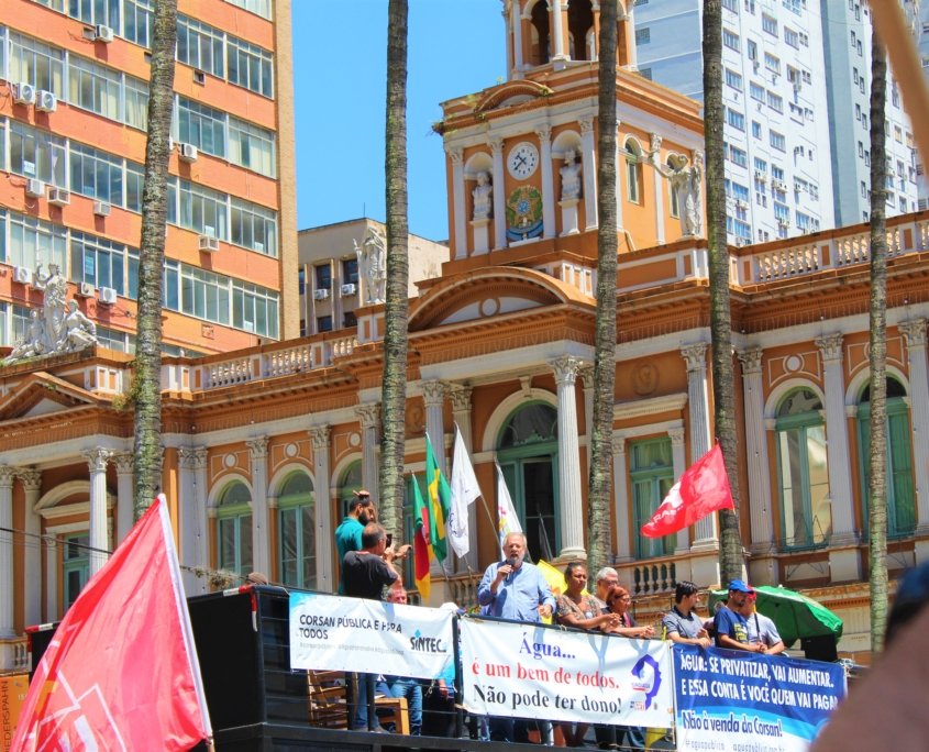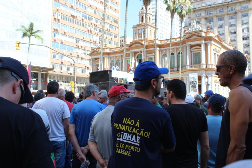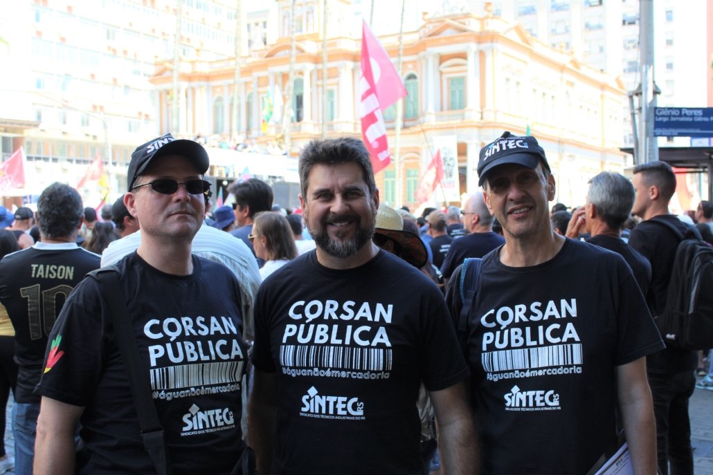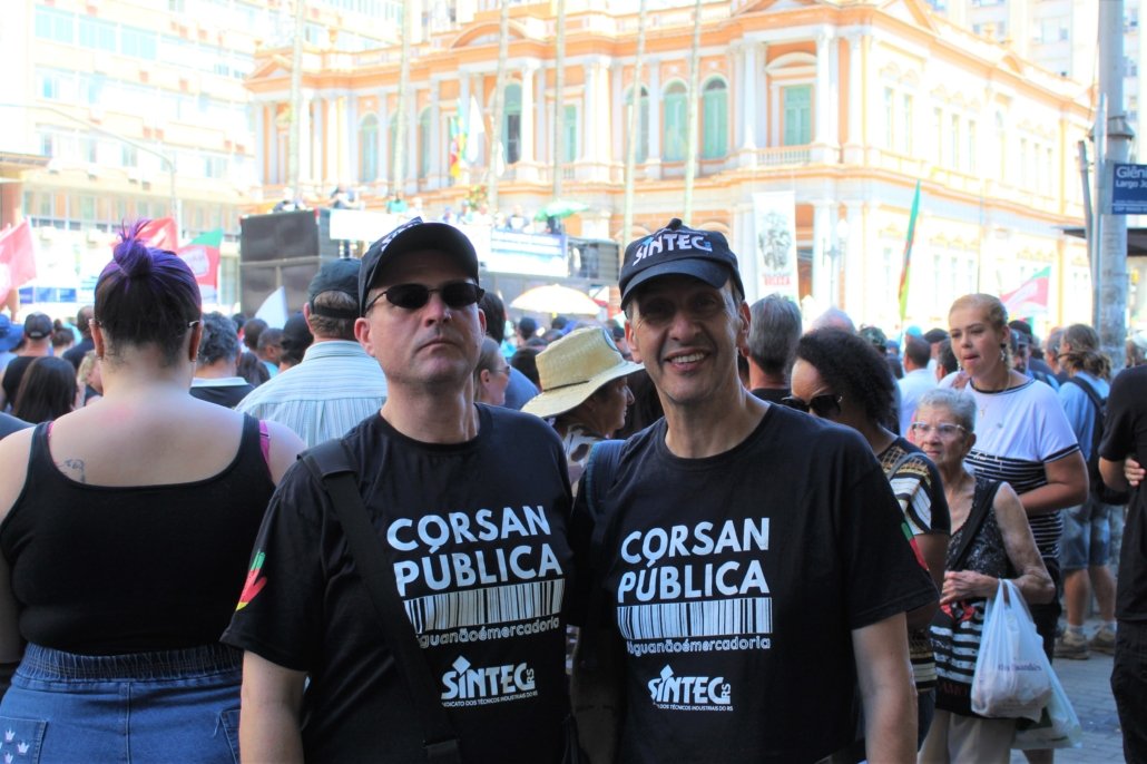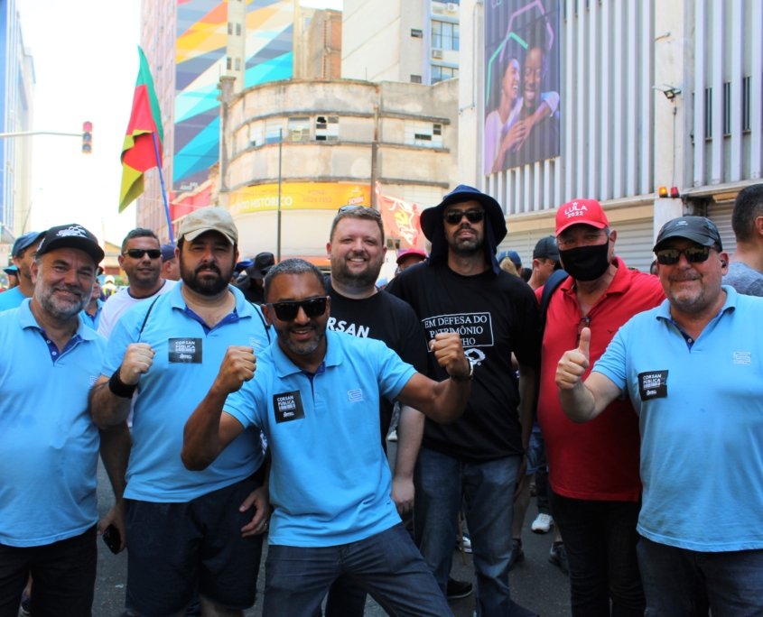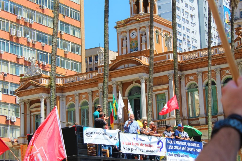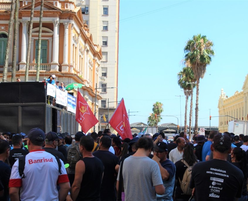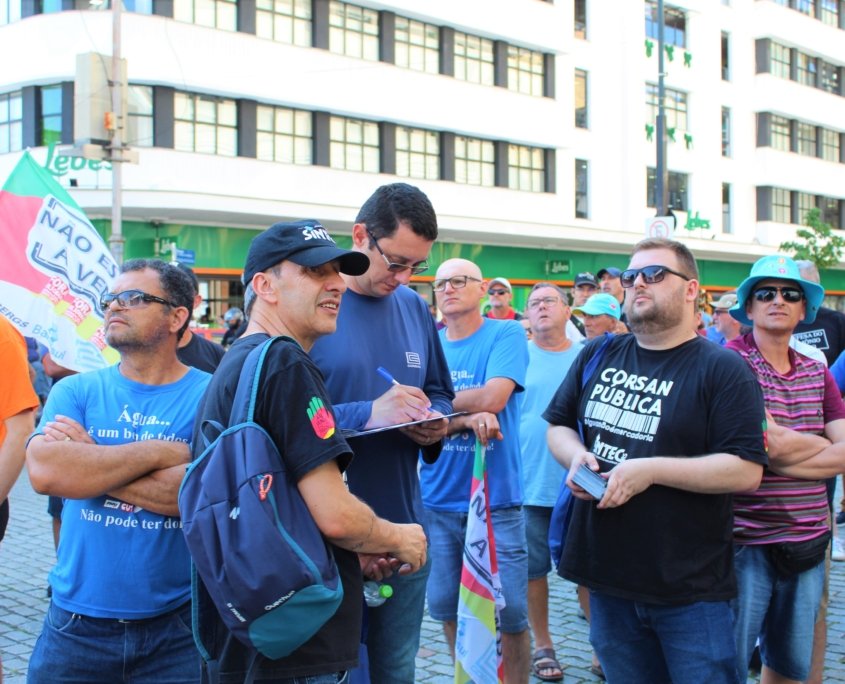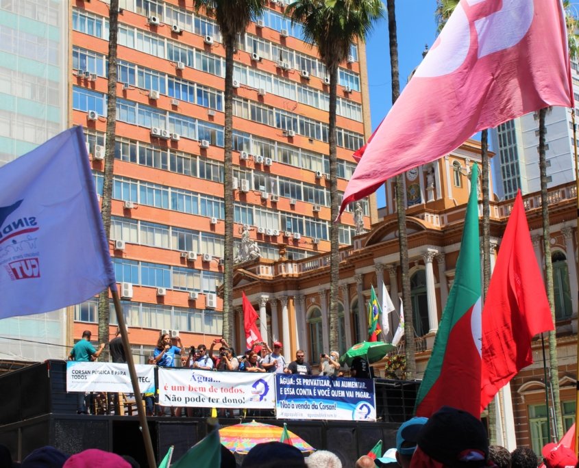 A manifestação, que defende a manutenção da Corsan e do DMAE públicos, reuniu sindicatos, trabalhadores e trabalhadoras das duas empresas, representantes da classe política e movimentos sociais na defesa da água pública.
