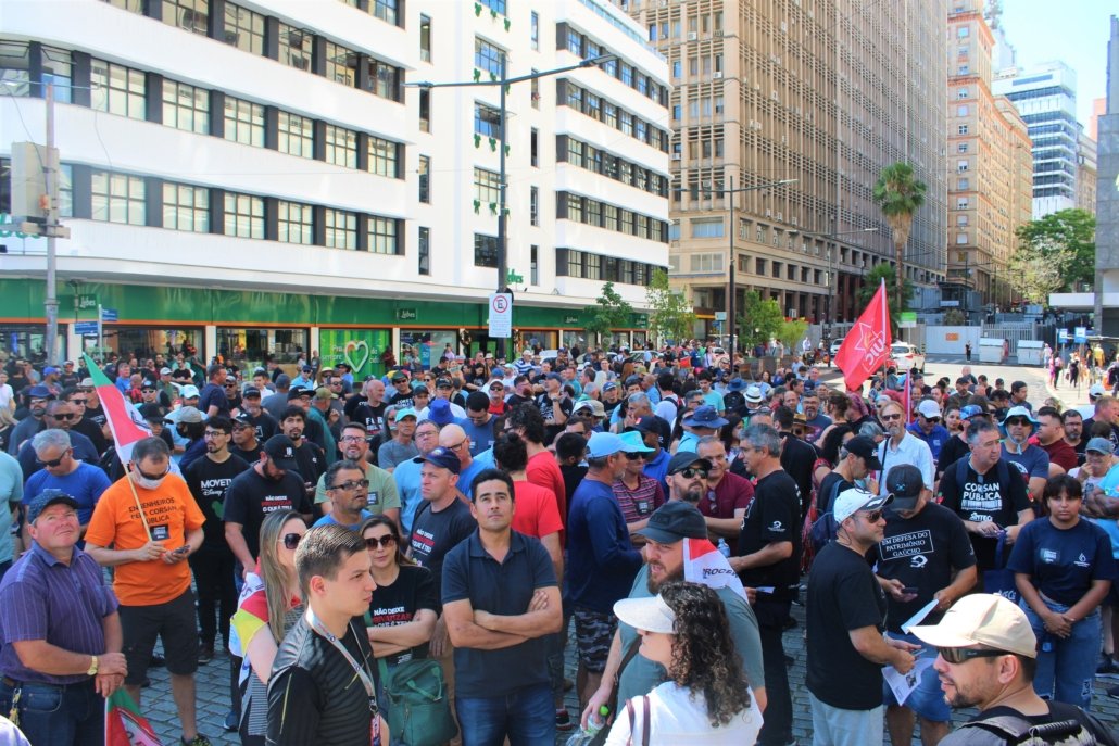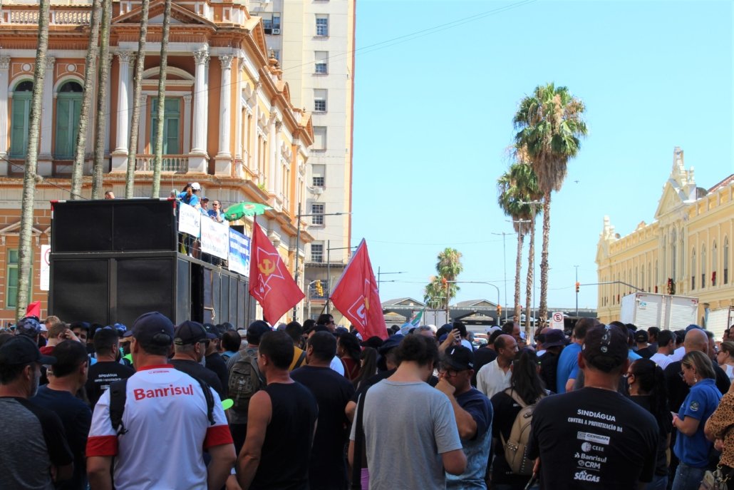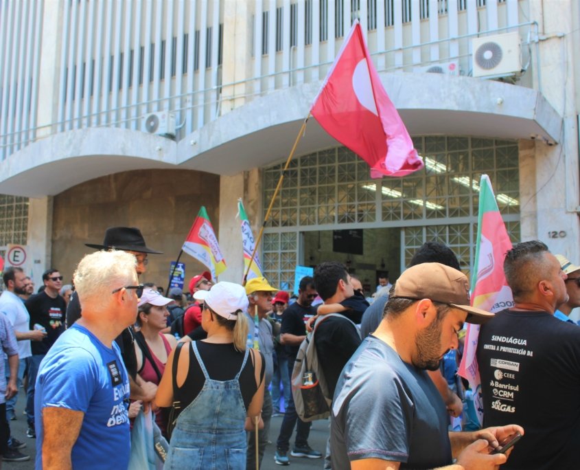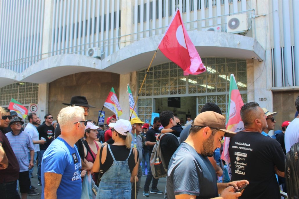 O movimento teve início às 9h30, no largo Glênio Peres e, após, seguiu até o Tribunal de Contas do Estado (TCE), com término em frente à sede da Corsan.
