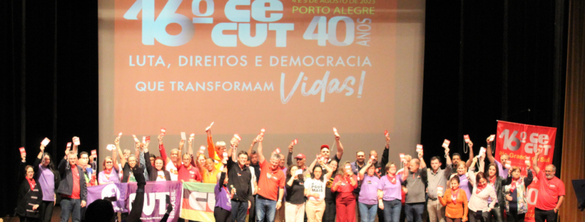 Nos dias 4 e 5 de agosto o SINTEC-RS participou do 16º Congresso Estadual da CUT do Rio Grande do Sul, CECUT-RS, realizado no Teatro Dante Barone, na Assembleia Legislativa. O congresso, com o tema “Luta, direitos e democracia transformam vidas”, reuniu mais de 400 delegados e delegadas, além de observadores e convidados, que acompanharam o balanço do último período da CUT-RS, a aprovação de resoluções sobre estratégias e um plano de lutas, bem como, a eleição da nova gestão para o mandato de 2023-2027.