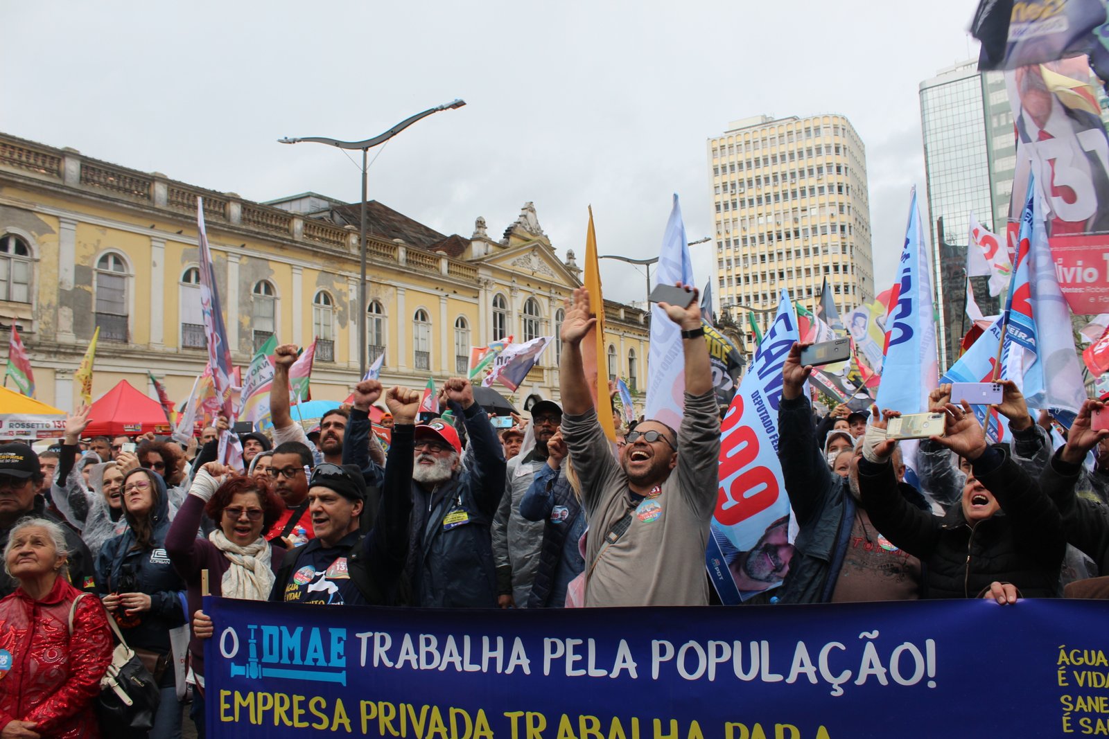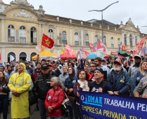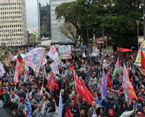 Trabalhadores e trabalhadoras de mais de 300 municípios atendidos pela Corsan vieram até Porto Alegre para participar do movimento, contra a privatização da Companhia Riograndense de Saneamento (Corsan) e do Departamento Municipal de Água e Esgoto (Dmae).