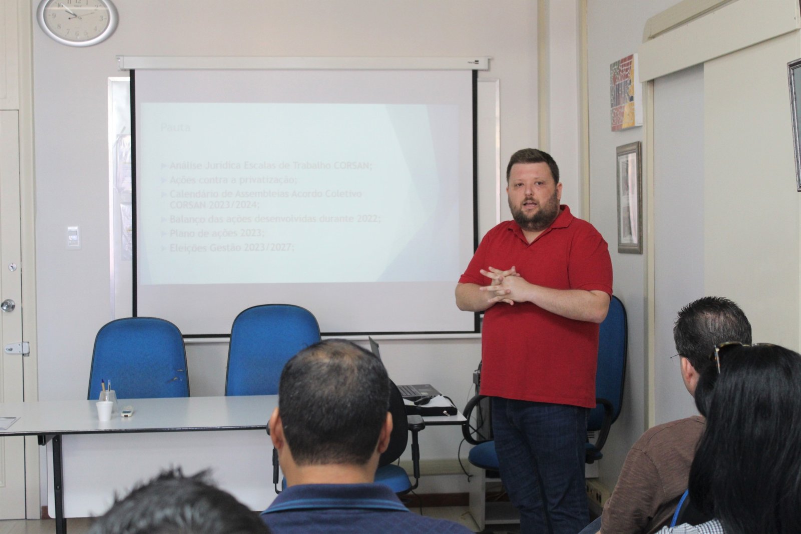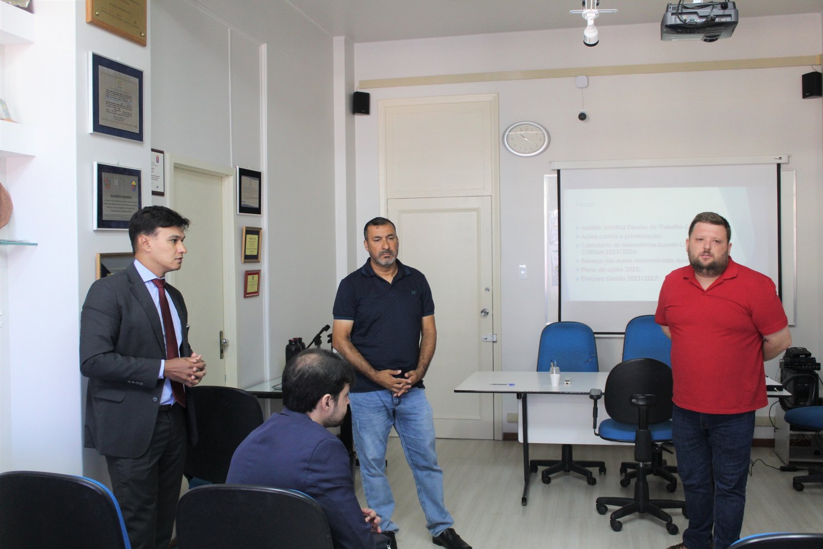 Nesta terça-feira, 7, o SINTEC-RS realizou uma reunião com os diretores e delegados da CORSAN, na parte da manhã, para tratar sobre possíveis ações contra o processo de privatização da Companhia e o calendário de assembleias para negociação do Acordo Coletivo de Trabalho 2023-2024, entre outros assuntos. A assessoria jurídica do sindicato, Forbrig Advogados, também participou da reunião, representada pelo Dr. Alexandre Pastl e pelo Dr. João Lemos.