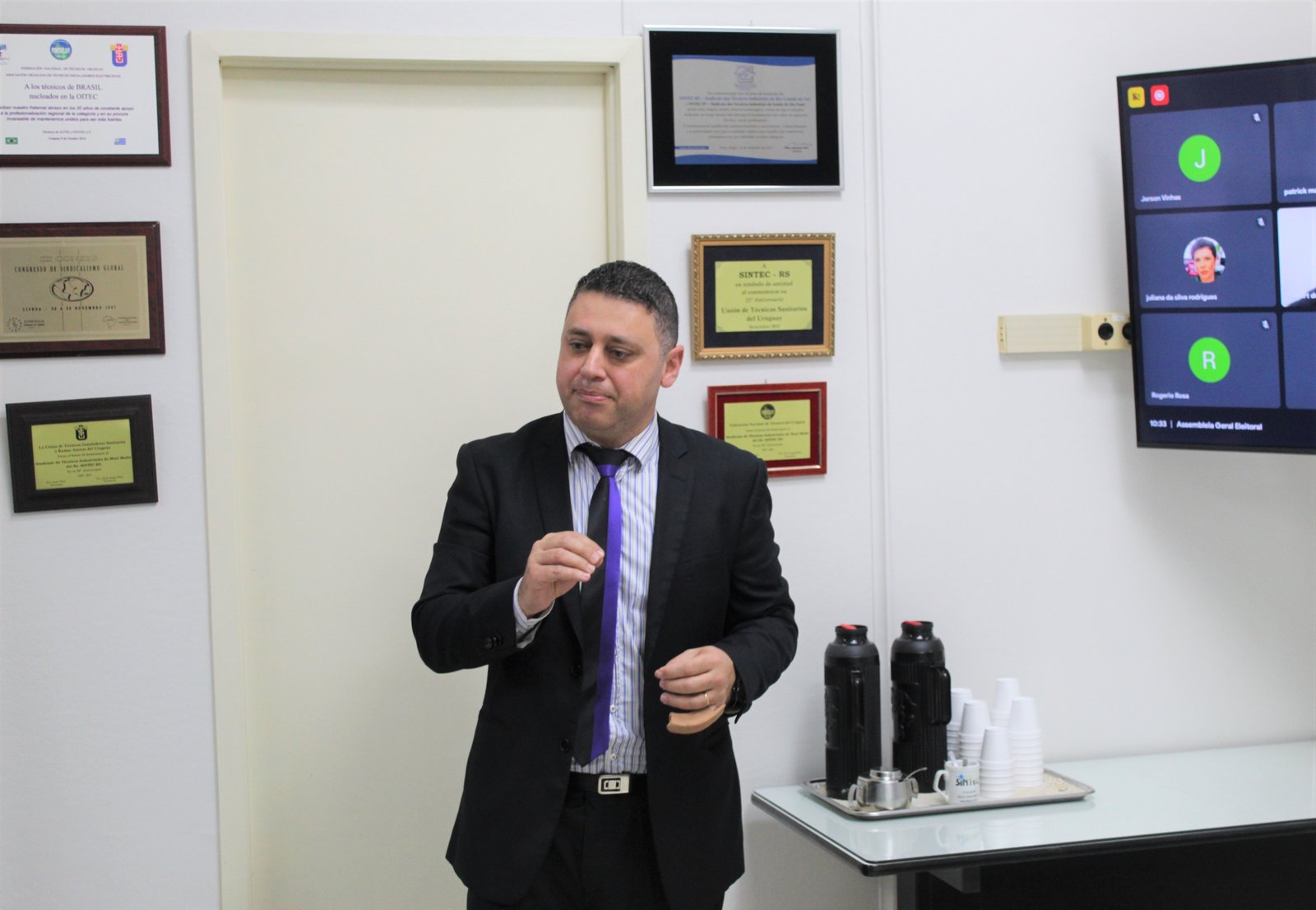 Na manhã desta quarta-feira, 5 de julho, o SINTEC-RS realizou a assembleia geral eleitoral convocada, conforme Estatuto da entidade e Regulamento Eleitoral vigente, para aclamação da chapa única inscrita para o processo eleitoral 2023-2027. Na ocasião, César Borges, presidente do sindicato, iniciou a assembleia e realizou a leitura do edital de convocação. Em seguida, convidou o presidente da Comissão Eleitoral, Jeferson Matheus, para compor a mesa. Jeferson realizou a leitura da Ata da última reunião da Comissão, que homologou a chapa inscrita, e declarou a eleição da referida chapa.