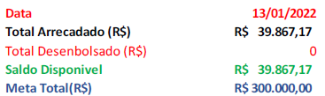 Até o dia 21 de janeiro, foram arrecadados R$ 50.287,17, valor que representa 50,29% da meta inicial estipulada em R$ 100 mil até o dia 31 de janeiro.