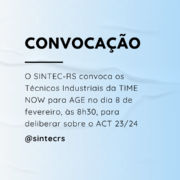 O Diretor-Presidente do SINDICATO DOS TÉCNICOS INDUSTRIAIS DE NÍVEL MÉDIO DO ESTADO DO RIO GRANDE DO SUL – SINTEC-RS, no uso de suas atribuições legais e estatutárias, convoca categoria dos Técnicos Industriais empregados da TIME NOW ENGENHARIA para ASSEMBLEIA GERAL EXTRAORDINÁRIA a realizar-se no dia 11 de novembro de 2025, em formato virtual pela plataforma Google Meet (link disponibilizado por e-mail), às 12h00min em primeira chamada e às 12h30min em segunda chamada, para deliberarem sobre a seguinte ORDEM DO DIA: