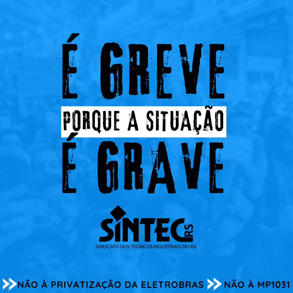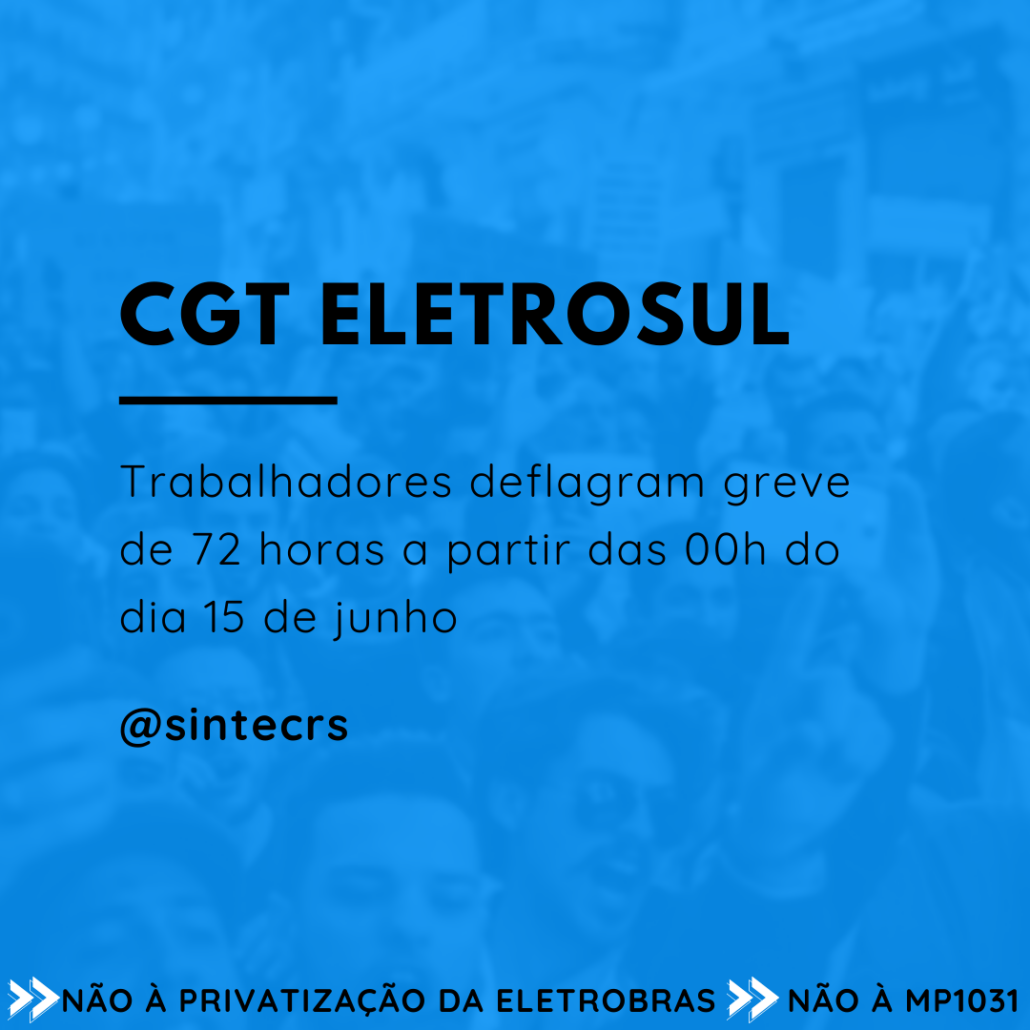 O SINTEC-RS comunica que, conforme deliberado em Assembleia, os trabalhadores e trabalhadoras da ELETROBRAS – CGT Eletrosul deflagrarão a greve de 72 horas a partir das 00h00min do dia 15 de junho. A paralisação é uma resposta ao agendamento da MP 1031, que prevê a privatização da ELETROBRAS, na pauta de votação no Senado. Além disso, a greve também é uma reação ao descumprimento do Acordo Coletivo de Trabalho Nacional, à não renovação de ACT’s Específicos e às demissões de dirigentes sindicais.