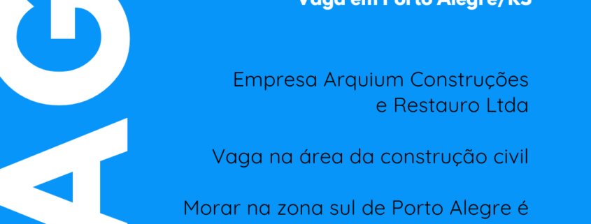 A Arquium Construções e Restauro Ltda está contratando Técnico em Edificações, para atuar na área da construção civil. Morar na zona sul de Porto Alegre é um diferencial.